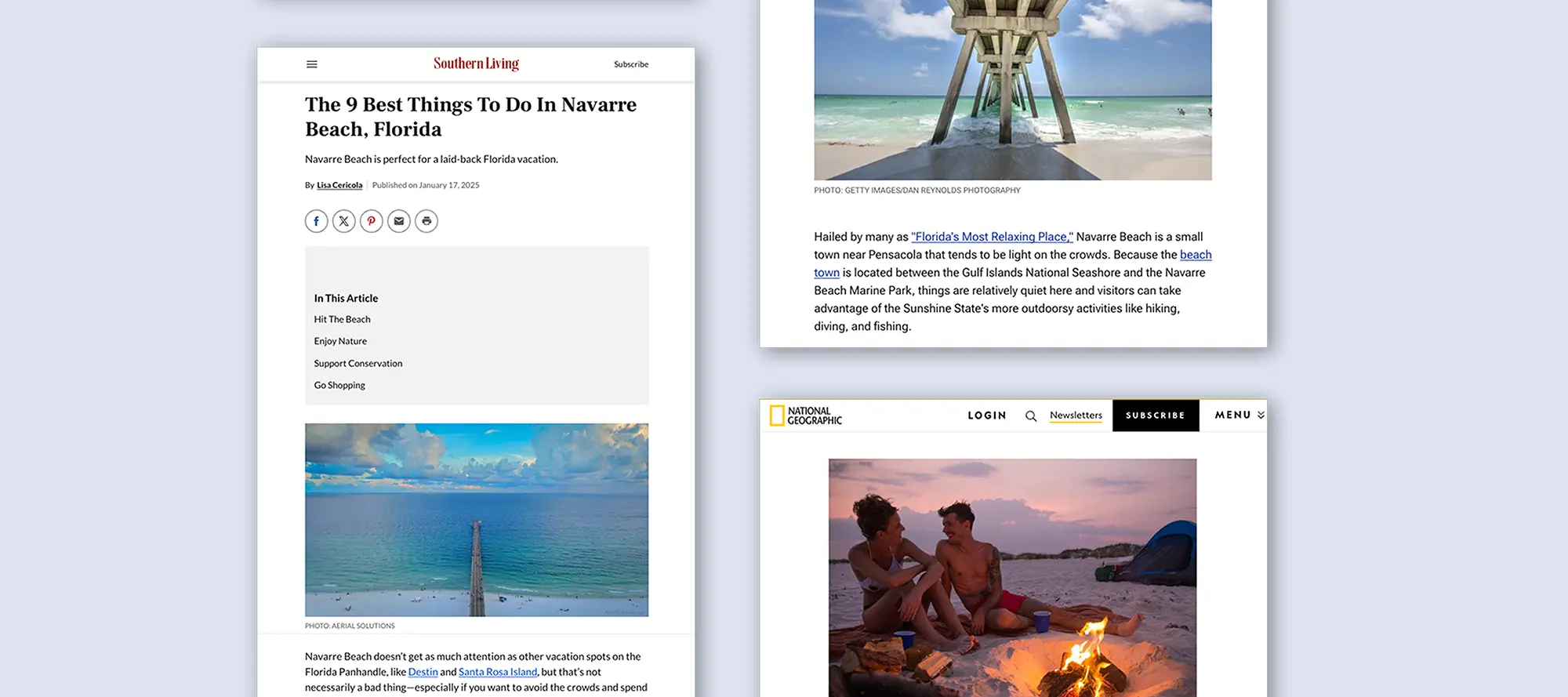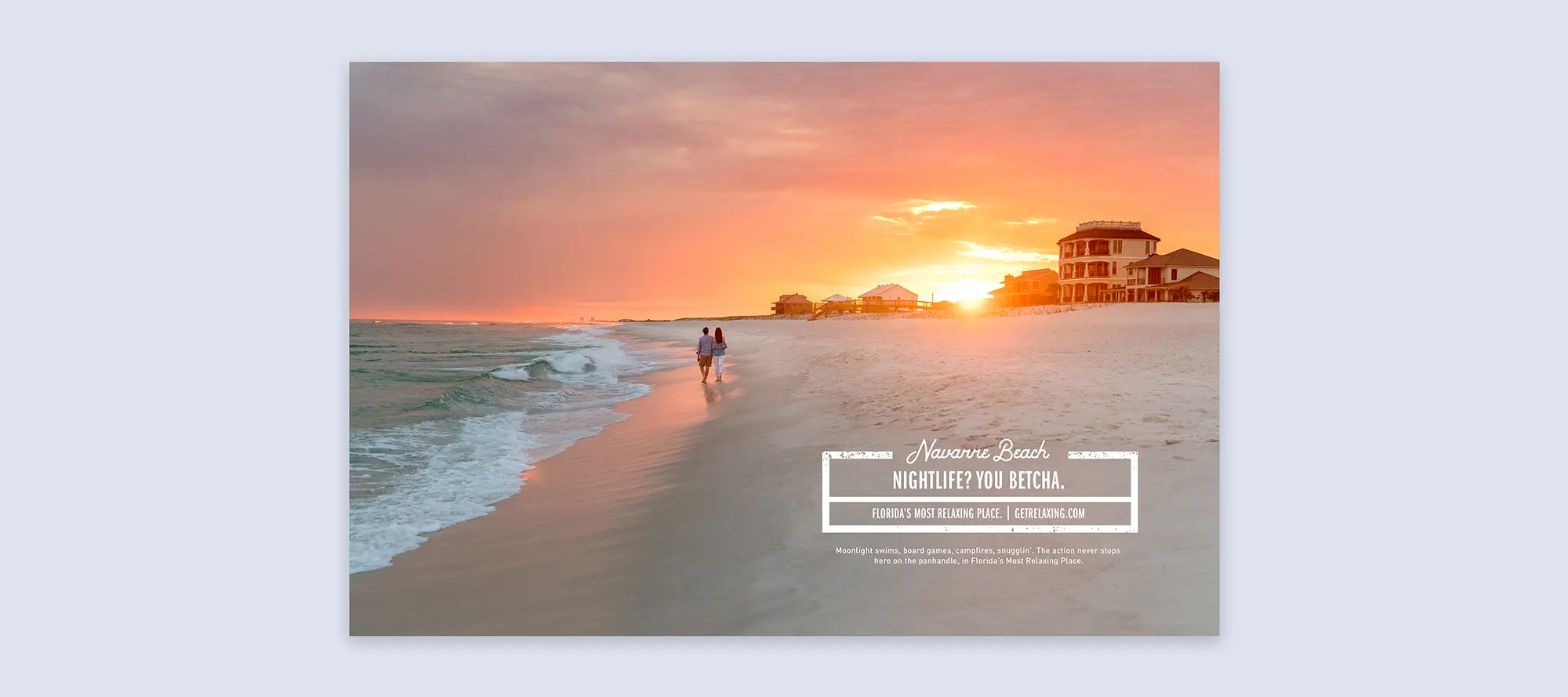 Santa Rosa County features uncrowded, unspoiled Gulf of Mexico beaches with soft, pearl white sand and emerald waves. After being named the agency of record in 2016, our extensive research led us to create a memorable, easily searchable consumer brand. We put the destination’s biggest asset front and center – the beach – and promised potential visitors the one thing they wanted most from a vacation: relaxation. The “Navarre Beach. Florida’s Most Relaxing Place” brand extends through strategic integrated marketing communications plans across a variety of consumer segments and target markets.